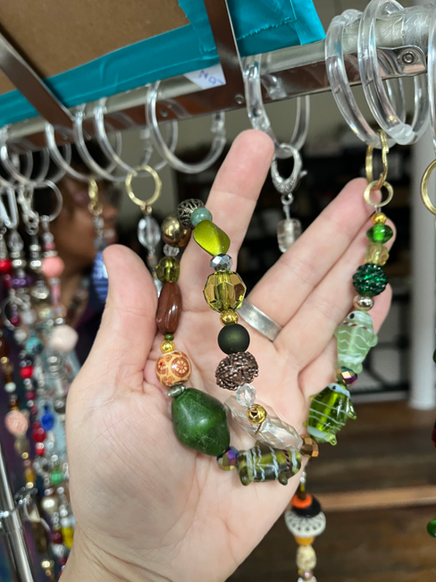 These sparkling, one-of-a-kind sun catchers are handcrafted from jewelry, Mardi Gras Beads, antique chandelier crystals, pendants, plus findings of all sorts. Suncatchers come in a endless variety of colors and combinations, from 16 to 26 inches long.